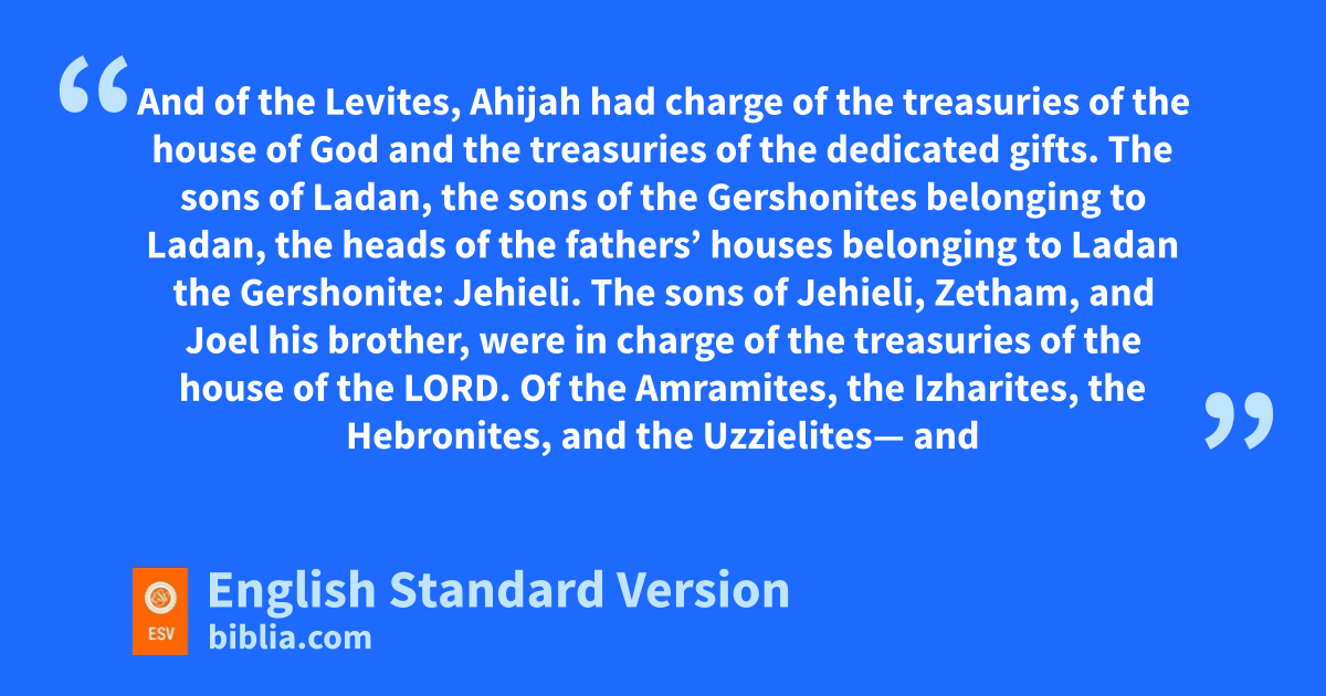 20 And of the Levites, Ahijah had charge of othe treasuries of the house of God and the treasuries of the dedicated gifts. 21 The sons of Ladan, the sons of the Gershonites belonging to Ladan, the heads of the fathers’ houses belonging to Ladan the Gershonite: pJehieli.3