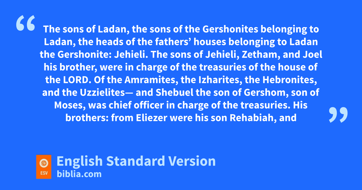 20 And of the Levites, Ahijah had charge of othe treasuries of the house of God and the treasuries of the dedicated gifts. 21 The sons of Ladan, the sons of the Gershonites belonging to Ladan, the heads of the fathers’ houses belonging to Ladan the Gershonite: pJehieli.3