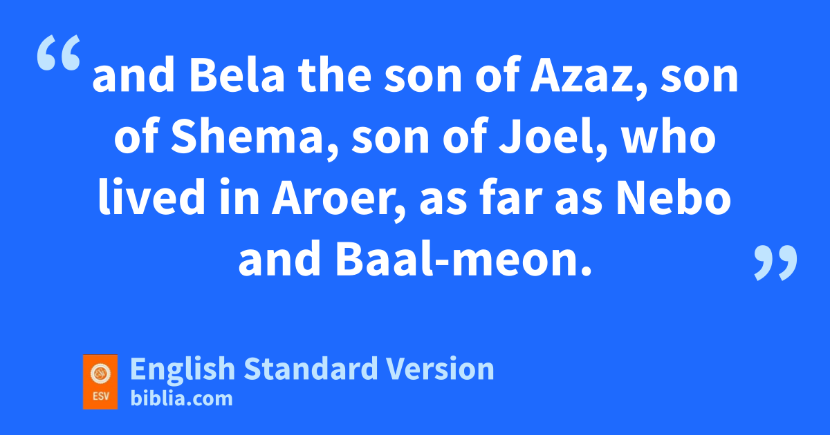 5 The sons of Reuben the firstborn of Israel (cfor he was the firstborn, but because dhe defiled his father’s couch, ehis birthright was given to the sons of Joseph the son of Israel, so that he could not be enrolled as the oldest son; 2 fthough Judah became strong among his brothers and a gchief came from him, yet the birthright belonged to Joseph), 3 the hsons of Reuben, the firstborn of Israel: Hanoch, Pallu, Hezron, and Carmi. 4 The sons of Joel: Shemaiah his son, Gog his son, Shimei his son, 5 Micah his son, Reaiah his son, Baal his son, 6 Beerah his son, whom iTiglath-pileser1 king of Assyria carried away into exile; he was a chief of the Reubenites. 7 And his kinsmen by their clans, jwhen the genealogy of their generations was recorded: the chief, Jeiel, and Zechariah, 8 and Bela the son of Azaz, son of kShema, son of Joel, who lived in lAroer, as far as mNebo and nBaal-meon. 9 He also lived to the east as far as the entrance of the desert this side of the Euphrates, because their livestock had multiplied oin the land of Gilead. 10 And in the days of Saul they waged war against the pHagrites, who fell into their hand. And they lived in their tents throughout all the region east of Gilead.