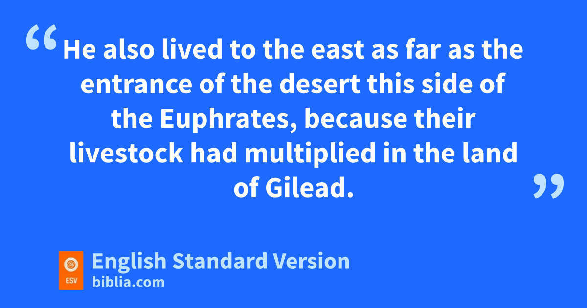5 The sons of Reuben the firstborn of Israel (cfor he was the firstborn, but because dhe defiled his father’s couch, ehis birthright was given to the sons of Joseph the son of Israel, so that he could not be enrolled as the oldest son; 2 fthough Judah became strong among his brothers and a gchief came from him, yet the birthright belonged to Joseph), 3 the hsons of Reuben, the firstborn of Israel: Hanoch, Pallu, Hezron, and Carmi. 4 The sons of Joel: Shemaiah his son, Gog his son, Shimei his son, 5 Micah his son, Reaiah his son, Baal his son, 6 Beerah his son, whom iTiglath-pileser1 king of Assyria carried away into exile; he was a chief of the Reubenites. 7 And his kinsmen by their clans, jwhen the genealogy of their generations was recorded: the chief, Jeiel, and Zechariah, 8 and Bela the son of Azaz, son of kShema, son of Joel, who lived in lAroer, as far as mNebo and nBaal-meon. 9 He also lived to the east as far as the entrance of the desert this side of the Euphrates, because their livestock had multiplied oin the land of Gilead. 10 And in the days of Saul they waged war against the pHagrites, who fell into their hand. And they lived in their tents throughout all the region east of Gilead.