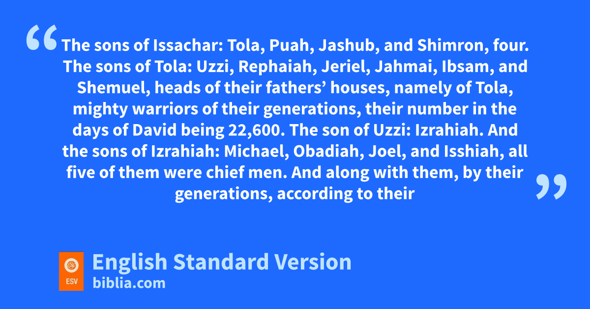 7 The sons1 of Issachar: Tola, iPuah, jJashub, and Shimron, four. 2 The sons of Tola: Uzzi, Rephaiah, Jeriel, Jahmai, Ibsam, and Shemuel, heads of their fathers’ houses, namely of Tola, mighty warriors of their generations, their number kin the days of David being 22,600. 3 The son2 of Uzzi: Izrahiah. And the sons of Izrahiah: Michael, Obadiah, Joel, and Isshiah, all five of them were chief men. 4 And along with them, by their generations, according to their fathers’ houses, were units of the army for war, 36,000, for they had many wives and sons. 5 Their kinsmen belonging to all the clans of Issachar were in all 87,000 mighty warriors, enrolled by genealogy.