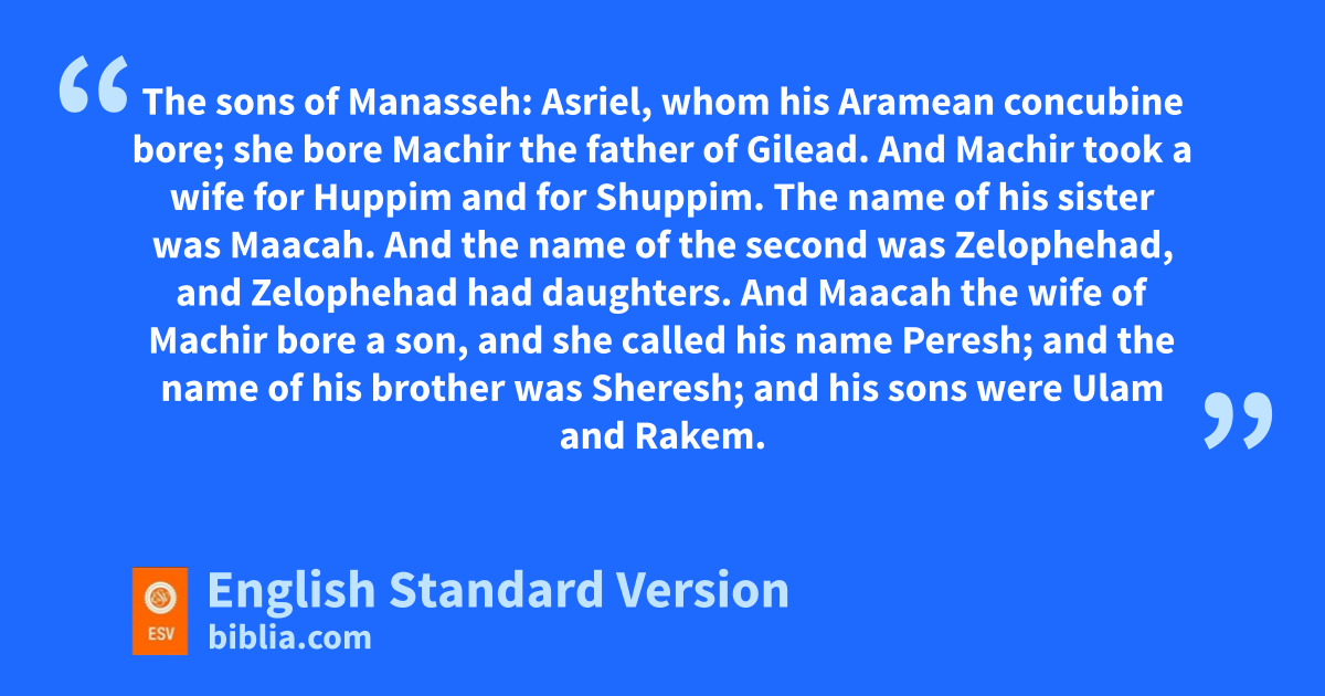 14 rThe sons of Manasseh: Asriel, whom his Aramean concubine bore; she bore sMachir the father of Gilead. 15 And Machir took a wife for Huppim and for Shuppim. The name of his sister was Maacah. And the name of the second was Zelophehad, and tZelophehad had daughters. 16 And Maacah the wife of Machir bore a son, and she called his name Peresh; and the name of his brother was Sheresh; and his sons were Ulam and Rakem. 17 The son of Ulam: uBedan. These were the sons of Gilead the son of Machir, son of Manasseh. 18 And his sister Hammolecheth bore Ishhod, Abiezer, and Mahlah. 19 The sons of Shemida were Ahian, Shechem, Likhi, and Aniam.