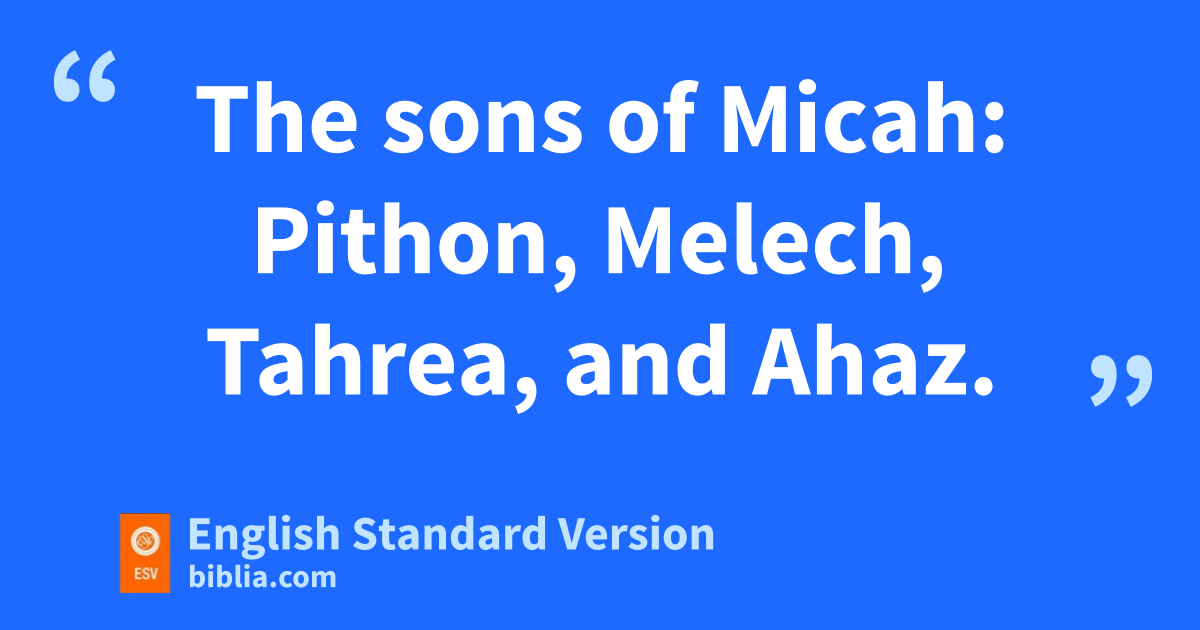 35 tIn Gibeon lived the father of Gibeon, Jeiel, and the name of his wife was Maacah, 36 and his firstborn son Abdon, then Zur, Kish, Baal, Ner, Nadab, 37 Gedor, Ahio, Zechariah, and Mikloth; 38 and Mikloth was the father of Shimeam; and these also lived opposite their kinsmen in Jerusalem, with their kinsmen. 39 uNer fathered Kish, Kish fathered Saul, Saul fathered Jonathan, Malchi-shua, Abinadab, and Eshbaal. 40 And the son of Jonathan was vMerib-baal, and Merib-baal fathered Micah. 41 The sons of Micah: Pithon, Melech, Tahrea, and wAhaz.1 42 And Ahaz fathered xJarah, and Jarah fathered Alemeth, Azmaveth, and Zimri. And Zimri fathered Moza. 43 Moza fathered Binea, and yRephaiah was his son, Eleasah his son, Azel his son. 44 Azel had six sons and these are their names: Azrikam, Bocheru, Ishmael, Sheariah, Obadiah, and Hanan; these were the sons of Azel.