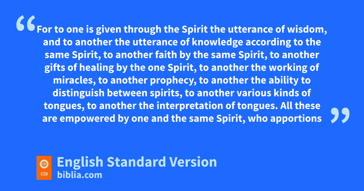 4 Now tthere are varieties of gifts, but uthe same Spirit; 5 and vthere are varieties of service, but uthe same Lord; 6 and there are varieties of activities, but it is uthe same God who empowers them all in everyone. 7 wTo each is given the manifestation of the Spirit for the common good. 8 For to one is given through the Spirit the utterance of xwisdom, and to another the utterance of yknowledge according to the same Spirit, 9 to another zfaith by the same Spirit, to another agifts of healing by the one Spirit, 10 to another bthe working of miracles, to another cprophecy, to another dthe ability to distinguish between spirits, to another evarious kinds of tongues, to another fthe interpretation of tongues. 11 All these are empowered by one and the same Spirit, gwho apportions to each one individually has he wills.
