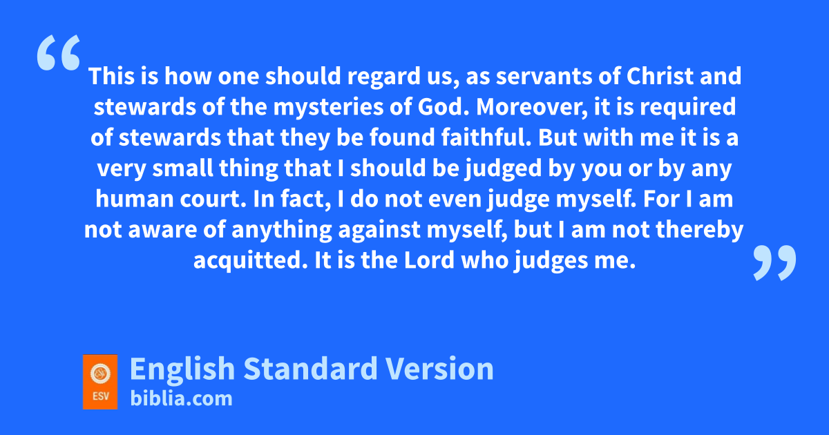 4 This is how one should regard us, as servants of Christ and nstewards of the mysteries of God. 2 Moreover, it is required of stewards that they be found faithful. 3 But with me it is a very small thing that I should be judged by you or by any human court. In fact, I do not even judge myself. 4 oFor I am not aware of anything against myself, pbut I am not thereby acquitted. It is the Lord who judges me. 5 Therefore qdo not pronounce judgment before the time, rbefore the Lord comes, swho will bring to light the things now hidden in darkness and will disclose the purposes of the heart. tThen each one will receive his commendation from God.