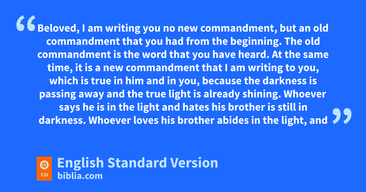 7 Beloved, I am writing you ino new commandment, but jan old commandment kthat you had from the beginning. The old commandment is the word that you have heard. 8 At the same time, it is la new commandment that I am writing to you, which is true in him and in you, because1 mthe darkness is passing away and nthe true light is already shining. 9 Whoever says he is in the light and ohates his brother is still in darkness. 10 Whoever loves his brother abides in the light, and in him2 there is no pcause for stumbling. 11 But whoever hates his brother is in the darkness and qwalks in the darkness, and does not know where he is going, because the darkness has blinded his eyes.