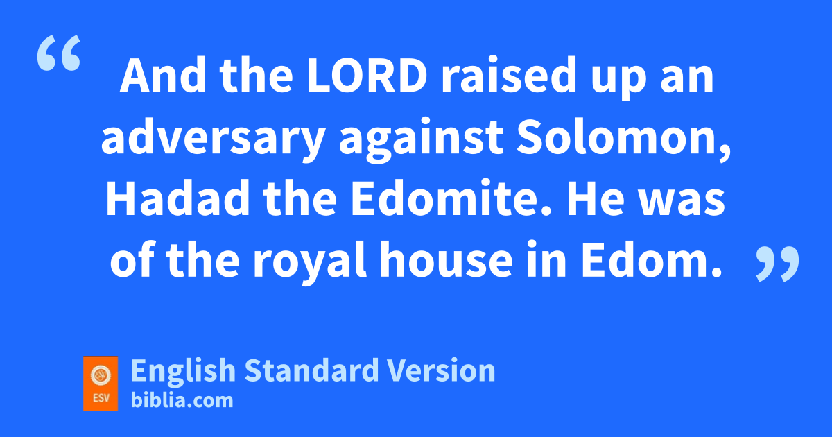 14 And the Lord raised up an adversary against Solomon, Hadad the Edomite. He was of the royal house in Edom. 15 For lwhen David was in Edom, and Joab the commander of the army went up to bury the slain, he struck down every male in Edom 16 (for Joab and all Israel remained there six months, until he had cut off every male in Edom). 17 But Hadad fled to Egypt, together with certain Edomites of his father’s servants, Hadad still being a little child. 18 They set out from Midian and came to mParan and took men with them from Paran and came to Egypt, to Pharaoh king of Egypt, who gave him a house and assigned him an allowance of food and gave him land. 19 And Hadad found great favor in the sight of Pharaoh, so that he gave him in marriage the sister of his own wife, the sister of Tahpenes the queen. 20 And the sister of Tahpenes bore him Genubath his son, whom Tahpenes weaned in Pharaoh’s house. And Genubath was in Pharaoh’s house among the sons of Pharaoh. 21 But when Hadad heard in Egypt nthat David slept with his fathers and that Joab the commander of the army was dead, Hadad said to Pharaoh, “Let me depart, that I may go to my own country.” 22 But Pharaoh said to him, “What have you lacked with me that you are now seeking to go to your own country?” And he said to him, “Only let me depart.”