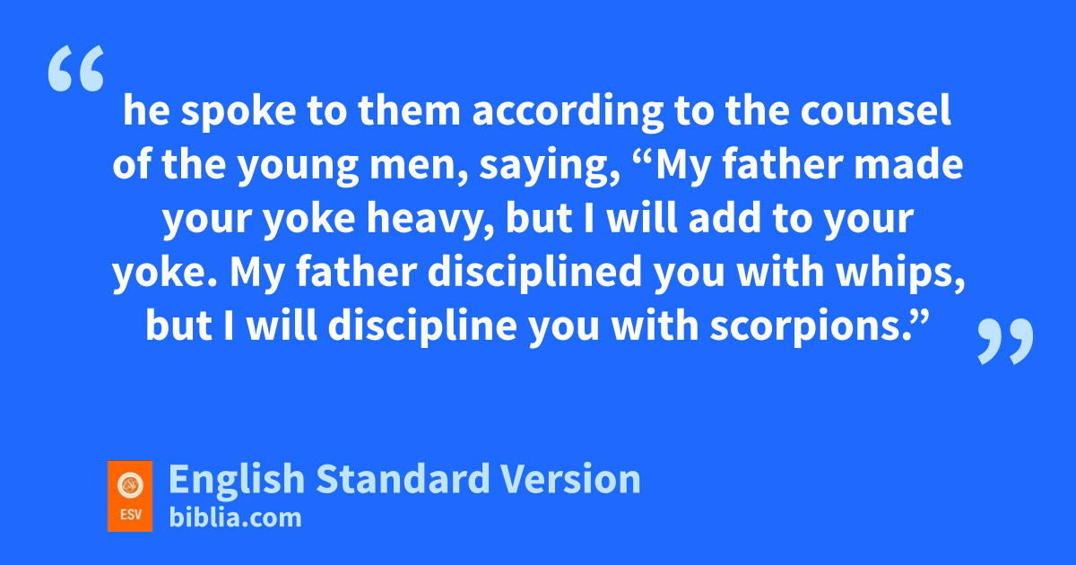 6 Then King Rehoboam took counsel with the old men, who had stood before Solomon his father while he was yet alive, saying, “How do you advise me to answer this people?” 7 And they said to him, “If you will be a servant to this people today and serve them, and speak good words to them when you answer them, then they will be your servants forever.” 8 But he abandoned the counsel that the old men gave him and took counsel with the young men who had grown up with him and stood before him. 9 And he said to them, “What do you advise that we answer this people who have said to me, ‘Lighten the yoke that your father put on us’?” 10 And the young men who had grown up with him said to him, “Thus shall you speak to this people who said to you, ‘Your father made our yoke heavy, but you lighten it for us,’ thus shall you say to them, ‘My little finger is thicker than my father’s thighs. 11 And now, whereas mmy father laid on you a heavy yoke, I will add to your yoke. My father disciplined you with whips, but I will discipline you with scorpions.’ ”
