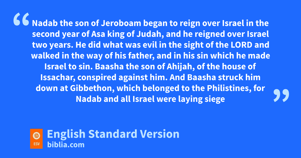 25 fNadab the son of Jeroboam began to reign over Israel in the second year of Asa king of Judah, and he reigned over Israel two years. 26 He did what was evil in the sight of the Lord gand walked in the way of his father, and in his sin hwhich he made Israel to sin.