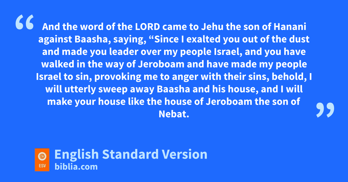 16 And the word of the Lord came to nJehu the son of oHanani against Baasha, saying, 2 “Since I pexalted you out of the dust and made you leader over my people Israel, and qyou have walked in the way of Jeroboam and have made my people Israel to sin, provoking me to anger with their sins, 3 behold, I will utterly rsweep away sBaasha and his house, and I will make your house tlike the house of Jeroboam the son of Nebat. 4 uAnyone belonging to Baasha who dies in the city the dogs shall eat, and anyone of his who dies in the field the birds of the heavens shall eat.”