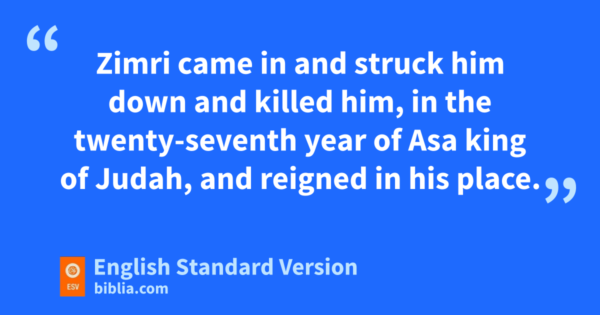 8 In the twenty-sixth year of Asa king of Judah, Elah the son of Baasha began to reign over Israel in Tirzah, and he reigned two years. 9 But his servant xZimri, commander of half his chariots, conspired against him. When he was at Tirzah, drinking himself drunk in the house of Arza, ywho was over the household in Tirzah, 10 Zimri came in and struck him down and killed him, in the twenty-seventh year of Asa king of Judah, and reigned in his place.