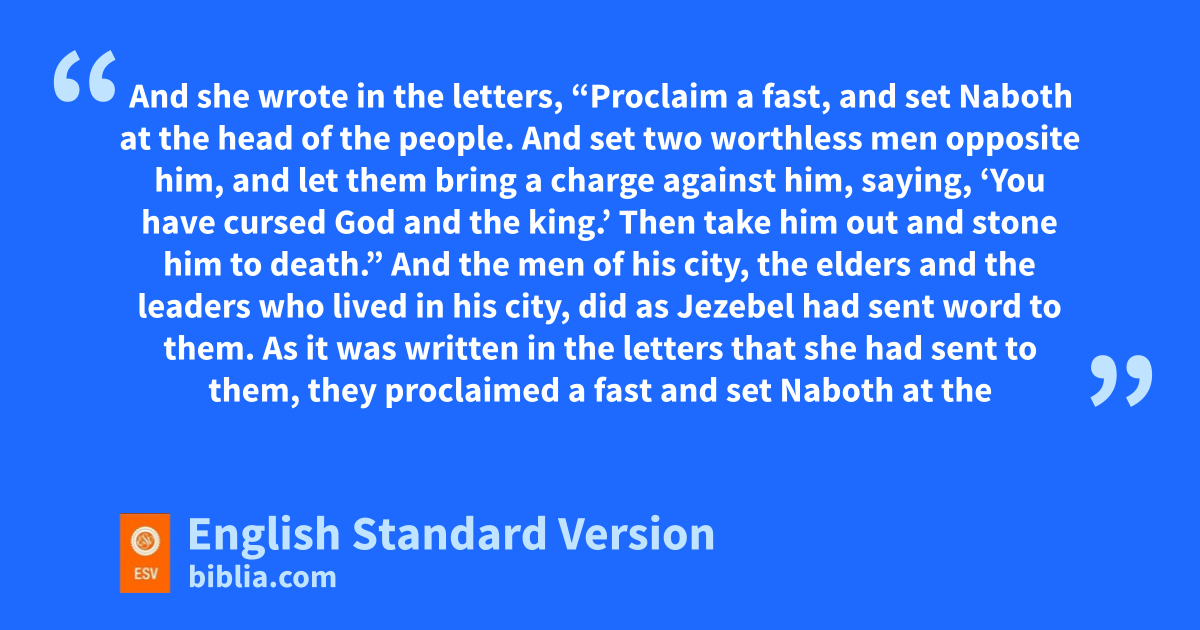 8 uSo she wrote letters in Ahab’s name and sealed them with his seal, and she sent the letters to vthe elders and the leaders who lived with Naboth in his city. 9 And she wrote in the letters, “Proclaim a fast, and set Naboth at the head of the people. 10 And set two wworthless men opposite him, and let them bring a charge against him, saying, x‘You have cursed1 God and the king.’ Then take him out and stone him to death.” 11 And the men of his city, vthe elders and the leaders who lived in his city, did as Jezebel had sent word to them. As it was written in the letters that she had sent to them, 12 ythey proclaimed a fast and set Naboth at the head of the people. 13 And the two worthless men came in and sat opposite him. And the worthless men brought a charge against Naboth in the presence of the people, saying, “Naboth cursed God and the king.” So they took him outside the city and stoned him to death with stones. 14 Then they sent to Jezebel, saying, “Naboth has been stoned; he is dead.”