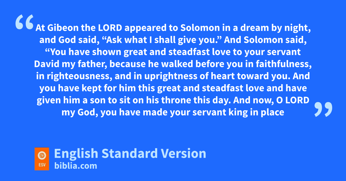 3 Solomon bloved the Lord, cwalking in the statutes of David his father, only he sacrificed and made offerings at the high places. 4 And the king went to Gibeon to sacrifice there, dfor that was the great high place. Solomon used to offer a thousand burnt offerings on that altar. 5 eAt Gibeon fthe Lord appeared to Solomon gin a dream by night, and God said, “Ask what I shall give you.” 6 And Solomon said, “You have shown great and steadfast love to your servant David my father, because hhe walked before you in faithfulness, in righteousness, and in uprightness of heart toward you. And you have kept for him this great and steadfast love and ihave given him a son to sit on his throne this day. 7 And now, O Lord my God, jyou have made your servant king in place of David my father, kalthough I am but a little child. I do not know lhow to go out or come in. 8 mAnd your servant is in the midst of your people whom you have chosen, a great people, ntoo many to be numbered or counted for multitude. 9 oGive your servant therefore an understanding mind pto govern your people, that I may qdiscern between good and evil, for who is able to govern this your great people?”