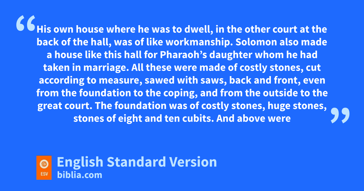 9 All these were made of costly stones, cut according to measure, sawed with saws, back and front, even from the foundation to the coping, and from the outside to the great court. 10 The foundation was of costly stones, huge stones, stones of eight and ten cubits. 11 And above were costly stones, cut according to measurement, and cedar. 12 dThe great court had three courses of cut stone all around, and a course of cedar beams; so had the inner court of the house of the Lord and ethe vestibule of the house.