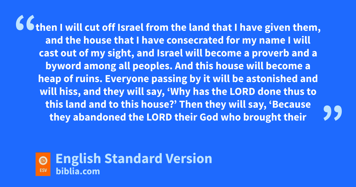 9 jAs soon as Solomon had finished building the house of the Lord kand the king’s house and lall that Solomon desired to build, 2 mthe Lord appeared to Solomon a second time, as he had appeared to him at Gibeon. 3 And the Lord said to him, “I have heard your prayer and your plea, which you have made before me. I have consecrated this house that you have built, nby putting my name there forever. oMy eyes and my heart will be there for all time. 4 And as for you, if you will pwalk before me, qas David your father walked, with integrity of heart and uprightness, doing according to all that I have commanded you, and keeping my statutes and my rules, 5 rthen I will establish your royal throne over Israel forever, as I promised David your father, saying, ‘You shall not lack a man on the throne of Israel.’ 6 sBut if you turn aside from following me, you or your children, and do not keep my commandments and my statutes that I have set before you, but go and serve other gods and worship them, 7 tthen I will cut off Israel from the land that I have given them, uand the house that I have consecrated for my name I will cast out of my sight, vand Israel will become a proverb and a byword among all peoples. 8 And this house will become a heap of ruins.1 Everyone passing by it will be astonished and will hiss, and they will say, w‘Why has the Lord done thus to this land and to this house?’ 9 Then they will say, ‘Because xthey abandoned the Lord their God who brought their fathers out of the land of Egypt and laid hold on other gods and worshiped them and served them. Therefore the Lord has brought all this disaster on them.’ ”