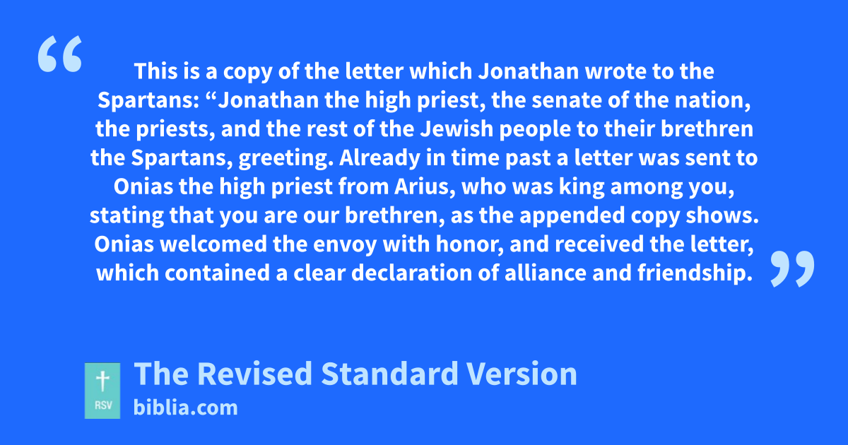 5 This is a copy of the letter which Jonathan wrote to the Spartans: 6 “Jonathan the high priest, the senate of the nation, the priests, and the rest of the Jewish people to their brethren the Spartans, greeting. 7 Already in time past a letter was sent to Onias the high priest from Arius, who was king among you, stating that you are our brethren, as the appended copy shows. 8 Onias welcomed the envoy with honor, and received the letter, which contained a clear declaration of alliance and friendship. 9 Therefore, though we have no need of these things, since we have as encouragement the holy books which are in our hands, 10 we have undertaken to send to renew our brotherhood and friendship with you, so that we may not become estranged from you, for considerable time has passed since you sent your letter to us. 11 We therefore remember you constantly on every occasion, both in our feasts and on other appropriate days, at the sacrifices which we offer and in our prayers, as it is right and proper to remember brethren. 12 And we rejoice in your glory. 13 But as for ourselves, many afflictions and many wars have encircled us; the kings round about us have waged war against us. 14 We were unwilling to annoy you and our other allies and friends with these wars, 15 for we have the help which comes from Heaven for our aid; and we were delivered from our enemies and our enemies were humbled. 16 We therefore have chosen Numenius the son of Antiochus and Antipater the son of Jason, and have sent them to Rome to renew our former friendship and alliance with them. 17 We have commanded them to go also to you and greet you and deliver to you this letter from us concerning the renewal of our brotherhood. 18 And now please send us a reply to this.”