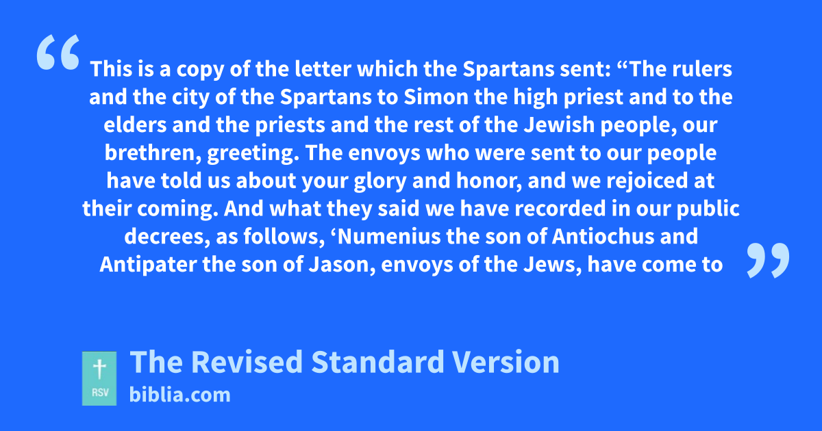 20 This is a copy of the letter which the Spartans sent: “The rulers and the city of the Spartans to Simon the high priest and to the elders and the priests and the rest of the Jewish people, our brethren, greeting. 21 The envoys who were sent to our people have told us about your glory and honor, and we rejoiced at their coming. 22 And what they said we have recorded in our public decrees, as follows, ‘Numenius the son of Antiochus and Antipater the son of Jason, envoys of the Jews, have come to us to renew their friendship with us. 23 It has pleased our people to receive these men with honor and to put a copy of their words in the public archives, so that the people of the Spartans may have a record of them. And they have sent a copy of this to Simon the high priest.’ ”