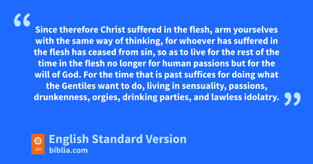 4 Since therefore zChrist suffered in the flesh,1 aarm yourselves with the same way of thinking, for bwhoever has suffered in the flesh chas ceased from sin, 2 dso as to live for ethe rest of the time in the flesh fno longer for human passions but gfor the will of God. 3 For the time that is past hsuffices ifor doing what the Gentiles want to do, living in sensuality, passions, drunkenness, orgies, drinking parties, and lawless idolatry. 4 With respect to this they are surprised when you do not join them in the same flood of jdebauchery, and kthey malign you; 5 but they will give account to him who is ready lto judge the living and the dead. 6 For this is why mthe gospel was preached even to those who are dead, that though judged in the flesh the way people are, they might live in the spirit the way God does.