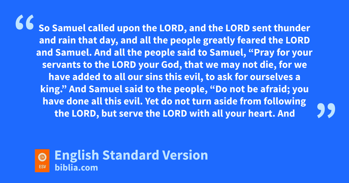 19 And all the people said to Samuel, y“Pray for your servants to the Lord your God, that we may not die, for we have added to all our sins this evil, to ask for ourselves a king.” 20 And Samuel said to the people, “Do not be afraid; you have done all this evil. Yet zdo not turn aside from following the Lord, but serve the Lord with all your heart. 21 And zdo not turn aside after aempty things that cannot profit or deliver, for they are empty. 22 bFor the Lord will not forsake his people, cfor his great name’s sake, because dit has pleased the Lord to make you a people for himself. 23 Moreover, as for me, far be it from me that I should sin against the Lord by ceasing eto pray for you, fand I will instruct you in the good and the right way. 24 gOnly fear the Lord and serve him faithfully with all your heart. For consider hwhat great things he has done for you. 25 But if you still do wickedly, iyou shall be swept away, jboth you and your king.”