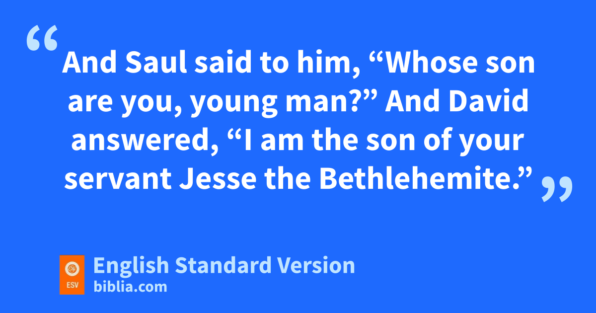55 As soon as Saul saw David go out against the Philistine, he said to Abner, ythe commander of the army, “Abner, zwhose son is this youth?” And Abner said, a“As your soul lives, O king, I do not know.” 56 And the king said, “Inquire whose son the boy is.” 57 And as soon as David returned from the striking down of the Philistine, Abner took him, and brought him before Saul bwith the head of the Philistine in his hand. 58 And Saul said to him, “Whose son are you, young man?” And David answered, c“I am the son of your servant Jesse the Bethlehemite.”