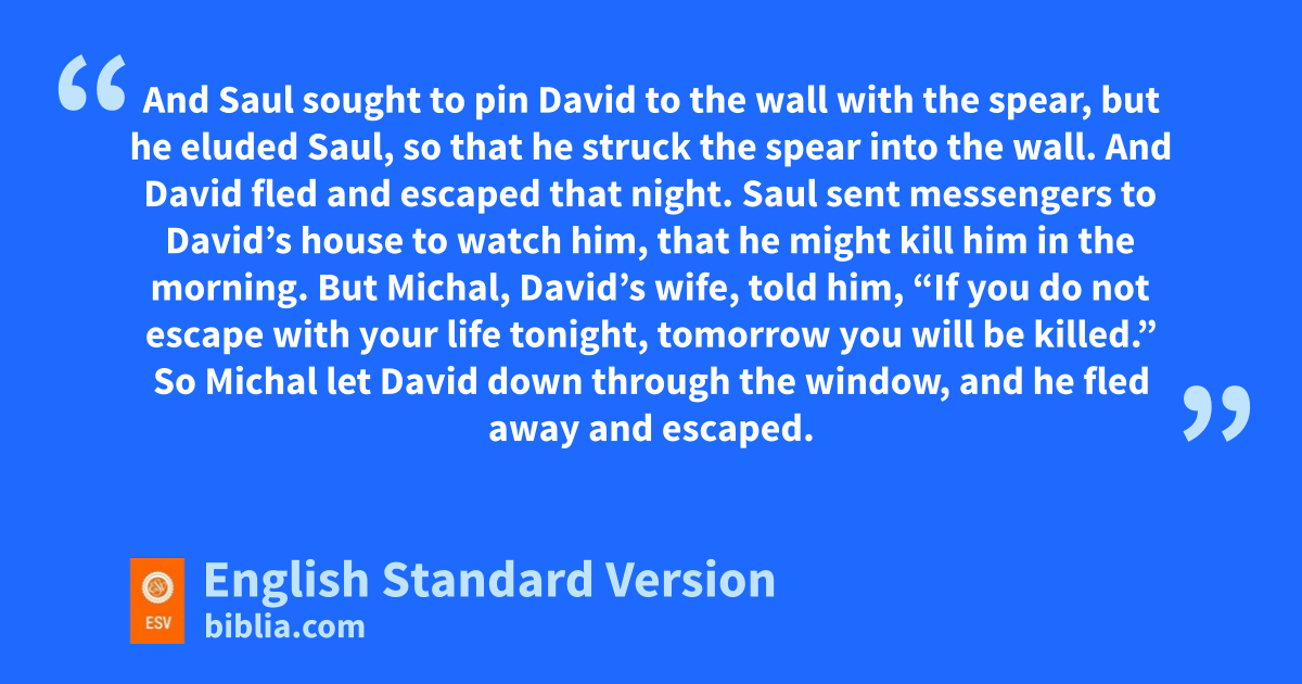 11 cSaul sent messengers to David’s house to watch him, that he might kill him in the morning. But Michal, David’s wife, told him, “If you do not escape with your life tonight, tomorrow you will be killed.” 12 dSo Michal let David down through the window, and he fled away and escaped. 13 Michal took ean image1 and laid it on the bed and put a pillow of goats’ hair at its head and covered it with the clothes. 14 And when Saul sent messengers to take David, she said, “He is sick.” 15 Then Saul sent the messengers to see David, saying, “Bring him up to me in the bed, that I may kill him.” 16 And when the messengers came in, behold, ethe image was in the bed, with the pillow of goats’ hair at its head. 17 Saul said to Michal, “Why have you deceived me thus and let my enemy go, so that he has escaped?” And Michal answered Saul, “He said to me, ‘Let me go. fWhy should I kill you?’ ”
