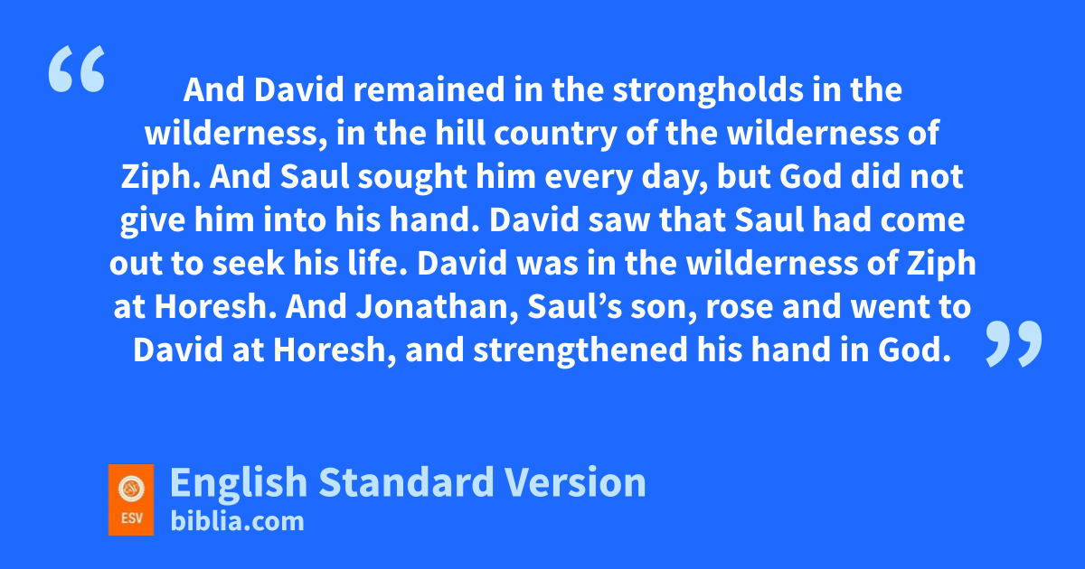 15 David saw that Saul had come out to seek his life. David was in the wilderness of Ziph at Horesh. 16 And Jonathan, Saul’s son, rose and went to David at Horesh, and strengthened his hand in God. 17 And he said to him, “Do not fear, for the hand of Saul my father shall not find you. You shall be king over Israel, and I shall be next to you. oSaul my father also knows this.” 18 pAnd the two of them made a covenant before the Lord. David remained at Horesh, and Jonathan went home.