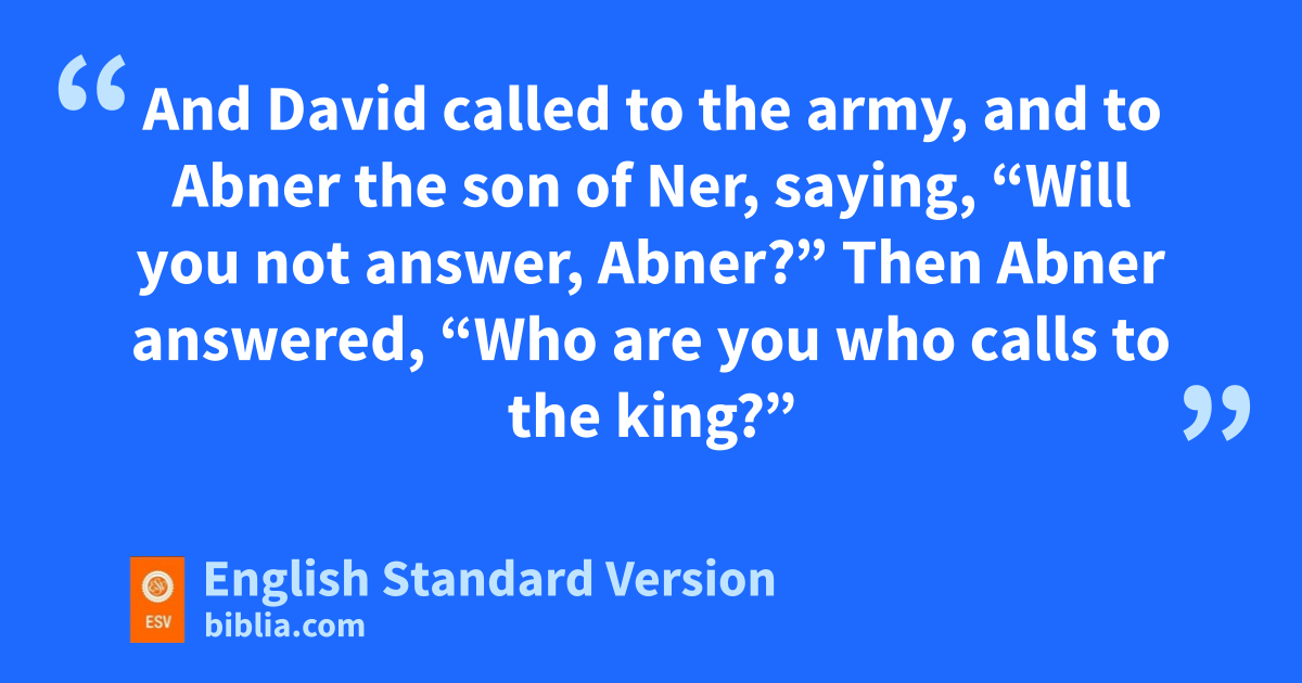 13 Then David went over to the other side and stood far off on the top of the hill, with a great space between them. 14 And David called to the army, and to Abner the son of Ner, saying, “Will you not answer, Abner?” Then Abner answered, “Who are you who calls to the king?” 15 And David said to Abner, “Are you not a man? Who is like you in Israel? Why then have you not kept watch over your lord the king? For one of the people came in to destroy the king your lord. 16 This thing that you have done is not good. kAs the Lord lives, you deserve to die, because you have not kept watch over your lord, the Lord’s anointed. And now see where the king’s spear is and the jar of water that was lat his head.”
