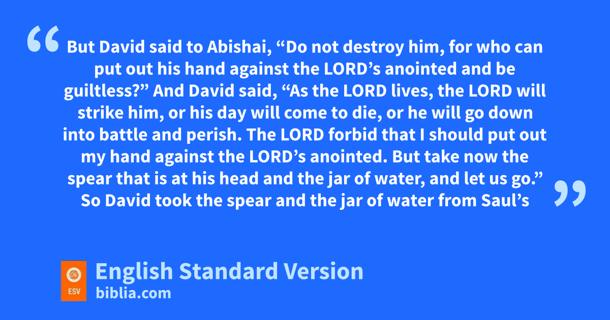 6 Then David said to Ahimelech the Hittite, and to Joab’s brother yAbishai the son of Zeruiah, z“Who will go down with me into the camp to Saul?” And Abishai said, “I will go down with you.” 7 So David and Abishai went to the army by night. And there lay Saul sleeping within xthe encampment, with his spear stuck in the ground aat his head, and Abner and the army lay around him. 8 Then Abishai said to David, b“God has given your enemy into your hand this day. Now please let me pin him to the earth with one stroke of the spear, and I will not strike him twice.” 9 But David said to Abishai, “Do not destroy him, for who can put out his hand cagainst the Lord’s anointed and be guiltless?” 10 And David said, d“As the Lord lives, ethe Lord will strike him, or fhis day will come to die, gor he will go down into battle and perish. 11 hThe Lord forbid that I should put out my hand against the Lord’s anointed. But take now the spear that is iat his head and the jar of water, and let us go.” 12 So David took the spear and the jar of water from Saul’s head, and they went away. No man saw it or knew it, nor did any awake, for they were all asleep, because ja deep sleep from the Lord had fallen upon them.