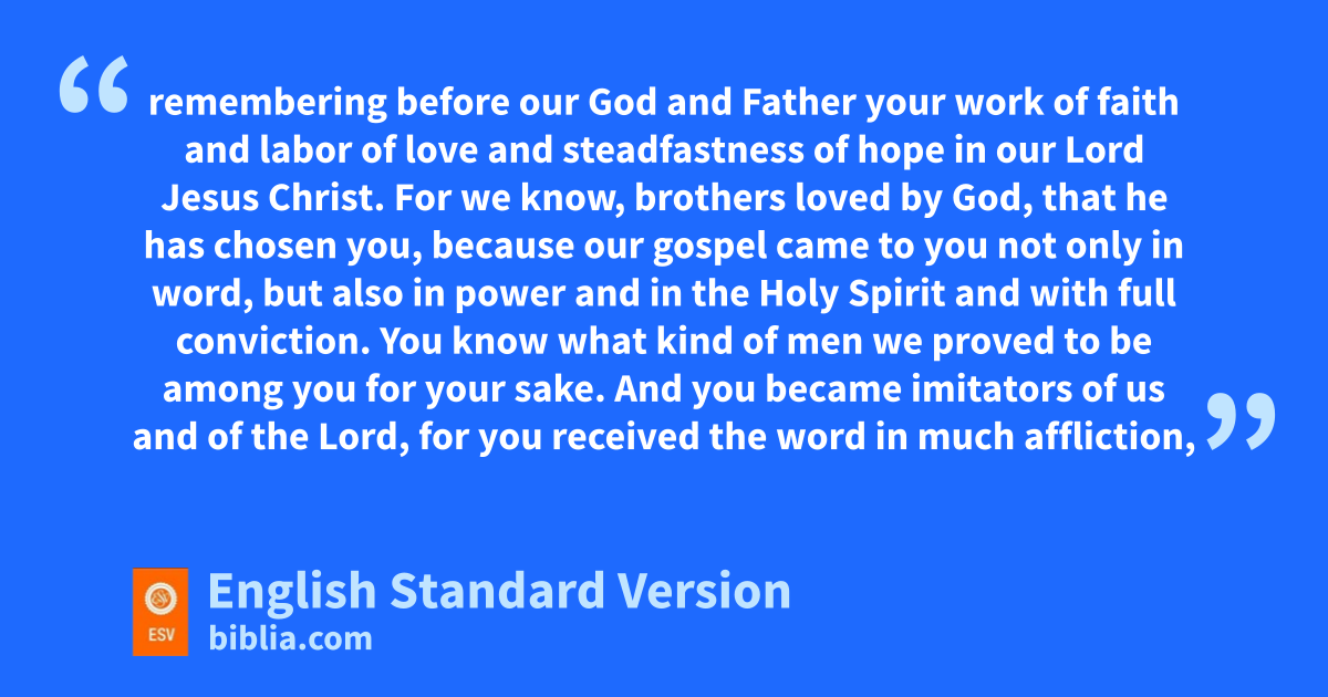 2 dWe give thanks to God always for all of you, constantly1 ementioning you in our prayers, 3 remembering before four God and Father gyour work of faith and labor of hlove and isteadfastness of hope in our Lord Jesus Christ. 4 For we know, jbrothers2 loved by God, kthat he has chosen you, 5 because lour gospel came to you not only in word, but also in power and min the Holy Spirit and with full nconviction. You know owhat kind of men we proved to be among you for your sake. 6 And pyou became imitators of us qand of the Lord, for ryou received the word in much affliction, swith the tjoy of the Holy Spirit, 7 so that you became an example to all the believers in Macedonia and in Achaia. 8 For not only has the word of the Lord usounded forth from you in Macedonia and Achaia, but your faith in God has gone forth veverywhere, so that we need not say anything. 9 For they themselves report concerning us the kind of wreception we had among you, and how xyou turned to God yfrom idols to serve the living and ztrue God, 10 and ato wait for his Son bfrom heaven, cwhom he raised from the dead, Jesus dwho delivers us from ethe wrath to come.