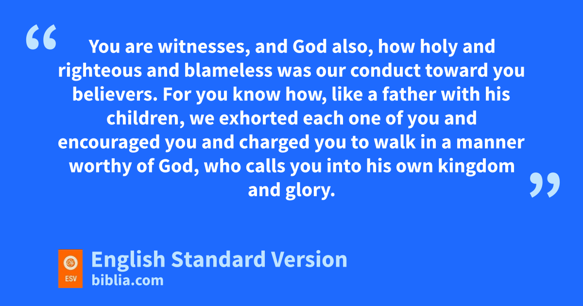 9 For you remember, brothers, bour labor and toil: we cworked night and day, that we might not be a burden to any of you, while we proclaimed to you the gospel of God. 10 You are witnesses, and dGod also, ehow holy and righteous and blameless was our conduct toward you believers. 11 For you know how, flike a father with his children, 12 we exhorted each one of you and encouraged you and gcharged hyou to walk in a manner worthy of God, iwho calls you into his own kingdom and glory.