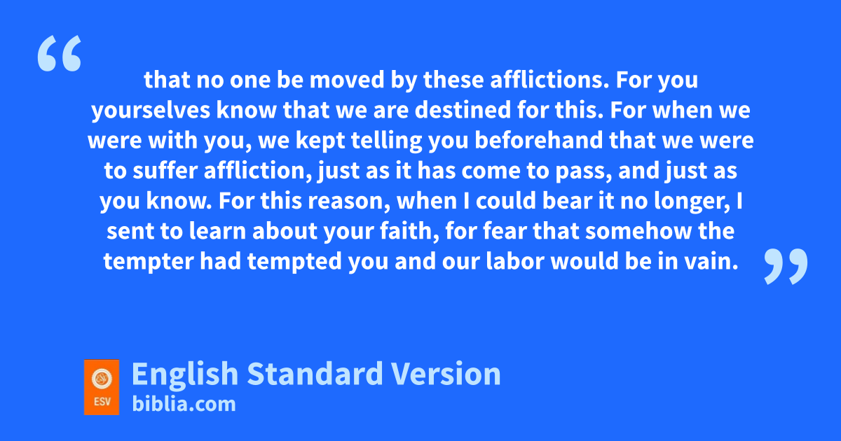 3 Therefore when we could bear it no longer, we were willing dto be left behind at Athens alone, 2 and we esent Timothy, four brother and God’s coworker1 in the gospel of Christ, to establish and exhort you in your faith, 3 that no one be moved by these afflictions. For you yourselves know that gwe are destined for this. 4 For when we were with you, we kept telling you beforehand that we were to suffer affliction, hjust as it has come to pass, and just as you know. 5 For this reason, iwhen I could bear it no longer, iI sent to learn about your faith, jfor fear that somehow kthe tempter had tempted you and lour labor would be in vain.