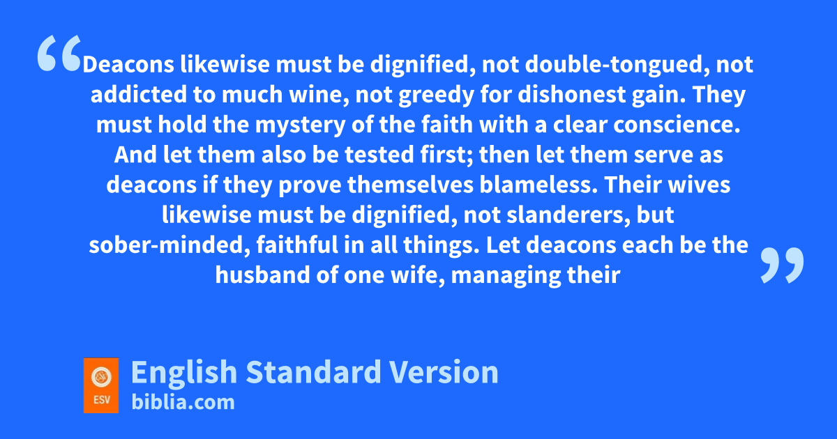 8 iDeacons likewise must be dignified, not double-tongued,3 jnot addicted to much wine, knot greedy for dishonest gain. 9 They must lhold the mystery of the faith with ma clear conscience. 10 And nlet them also be tested first; then let them serve as deacons if they prove themselves blameless. 11 oTheir wives likewise4 must be dignified, not slanderers, but sober-minded, pfaithful in all things. 12 Let deacons each be qthe husband of one wife, qmanaging their children and their own households well. 13 For rthose who serve well as deacons gain a good standing for themselves and also great confidence in the faith that is in Christ Jesus.