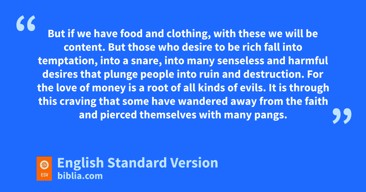 rTeach and urge these things. 3 If anyone steaches a different doctrine and does not agree with tthe sound2 words of our Lord Jesus Christ and the teaching uthat accords with godliness, 4 vhe is puffed up with conceit and wunderstands nothing. He has an unhealthy craving for xcontroversy and for yquarrels about words, which produce envy, dissension, slander, evil suspicions, 5 and constant friction among people zwho are depraved in mind and deprived of the truth, aimagining that godliness is a means of gain. 6 But bgodliness cwith contentment is great gain, 7 for dwe brought nothing into the world, and3 we cannot take anything out of the world. 8 But eif we have food and clothing, with these we will be content. 9 But fthose who desire to be rich fall into temptation, ginto a snare, into many senseless and harmful desires that hplunge people into ruin and destruction. 10 For the love of money is a root of iall kinds of evils. It is through this craving that some have wandered away from the faith and pierced themselves with many pangs.