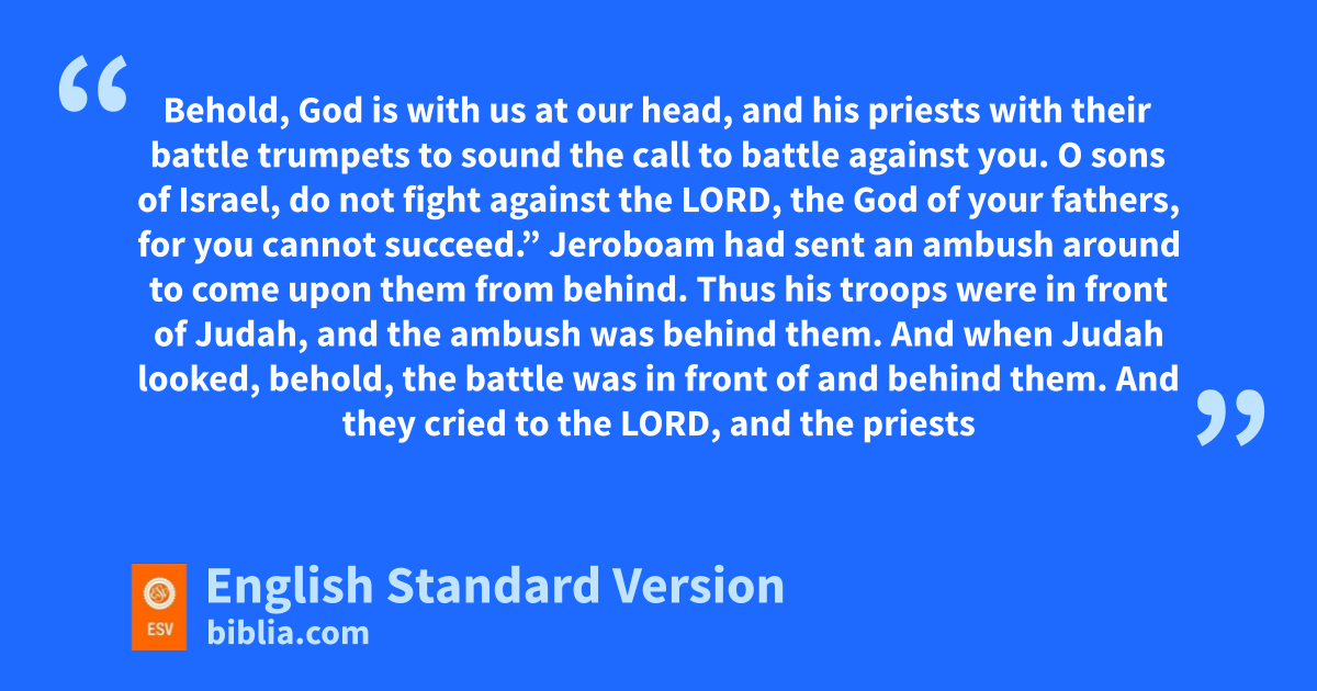 13 Jeroboam had sent van ambush around to come upon them from behind. Thus his troops5 were in front of Judah, and the ambush was behind them. 14 And when Judah looked, behold, the battle was in front of and behind them. wAnd they cried to the Lord, and the priests tblew the trumpets. 15 Then the men of Judah raised the battle shout. And when the men of Judah shouted, xGod defeated Jeroboam and all Israel before Abijah and Judah. 16 The men of Israel fled before Judah, yand God gave them into their hand. 17 Abijah and his people struck them with great force, so there fell slain of Israel 500,000 chosen men. 18 Thus the men of Israel were subdued at that time, and the men of Judah prevailed, zbecause they relied on the Lord, the God of their fathers. 19 And Abijah pursued Jeroboam aand took cities from him, Bethel with its villages and Jeshanah with its villages and bEphron6 with its villages. 20 Jeroboam did not recover his power in the days of Abijah. cAnd the Lord struck him down, dand he died. 21 But Abijah grew mighty. And he took fourteen wives and had twenty-two sons and sixteen daughters. 22 The rest of the acts of Abijah, his ways and his sayings, are written in the estory of the prophet fIddo.