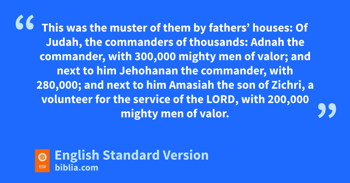 10 vAnd the fear of the Lord fell upon all the kingdoms of the lands that were around Judah, and they made no war against Jehoshaphat. 11 Some of the Philistines wbrought Jehoshaphat presents and silver for tribute, and the Arabians also brought him 7,700 rams and 7,700 goats. 12 And Jehoshaphat grew steadily greater. He built in Judah fortresses and store cities, 13 and he had large supplies in the cities of Judah. He had soldiers, mighty men of valor, in Jerusalem. 14 This was the muster of them by fathers’ houses: Of Judah, the commanders of thousands: Adnah the commander, with 300,000 mighty men of valor; 15 and next to him Jehohanan the commander, with 280,000; 16 and next to him Amasiah the son of Zichri, xa volunteer for the service of the Lord, with 200,000 mighty men of valor. 17 Of Benjamin: Eliada, a mighty man of valor, with 200,000 men yarmed with bow and shield; 18 and next to him Jehozabad with 180,000 armed for war. 19 These were in the service of the king, besides zthose whom the king had placed in the fortified cities throughout all Judah.
