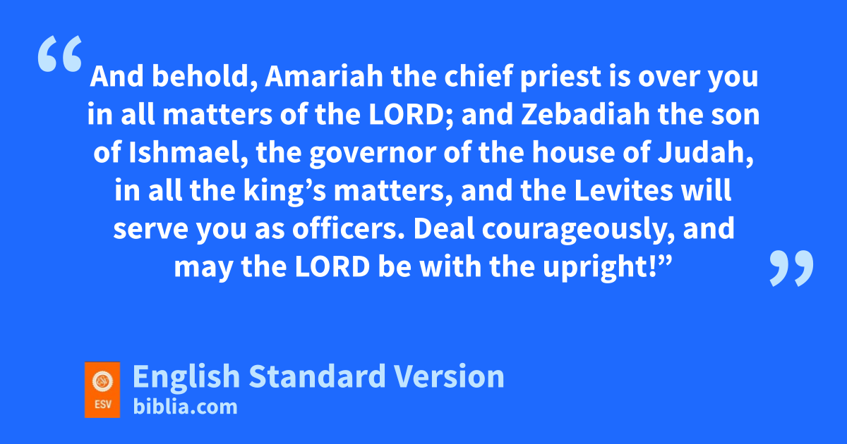 8 Moreover, in Jerusalem Jehoshaphat bappointed certain Levites and priests and heads of families of Israel, yto give judgment for the Lord and to decide disputed cases. They had their seat at Jerusalem. 9 And he charged them: c“Thus you shall do in the fear of the Lord, in faithfulness, dand with your whole heart: 10 ewhenever a case comes to you from your brothers who live in their cities, concerning bloodshed, law or commandment, statutes or rules, then you shall warn them, that they may not incur guilt before the Lord and fwrath may not come upon you and your brothers. Thus you shall do, and you will not incur guilt. 11 And behold, Amariah the chief priest is over you gin all matters of the Lord; and Zebadiah the son of Ishmael, the governor of the house of Judah, in all the king’s matters, and the Levites will serve you as officers. hDeal courageously, and may the Lord be with the upright!”1