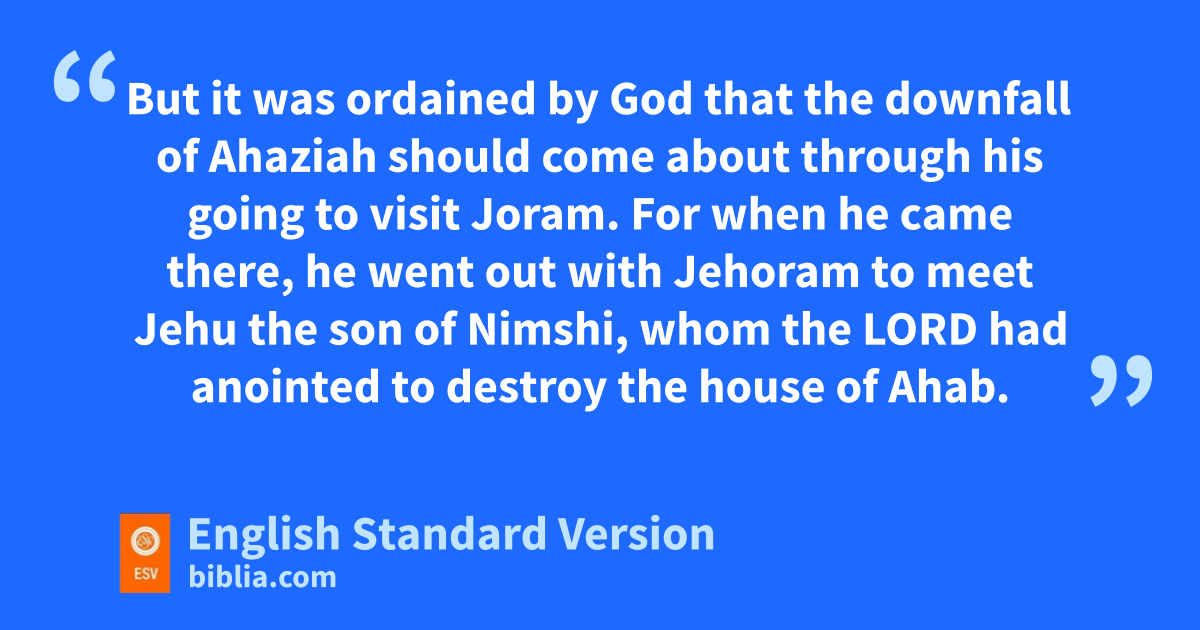7 But it was ordained by2 God that the downfall of Ahaziah should come about through his going to visit Joram. For when he came there, ehe went out with Jehoram to meet Jehu the son of Nimshi, fwhom the Lord had anointed to destroy the house of Ahab. 8 gAnd when Jehu was hexecuting judgment on the house of Ahab, he met the princes of Judah and the sons of Ahaziah’s brothers, who attended Ahaziah, and he killed them. 9 iHe searched for Ahaziah, and he was captured while hiding in Samaria, and he was brought to Jehu and put to death. jThey buried him, for they said, “He is the grandson of Jehoshaphat, kwho sought the Lord with all his heart.” And the house of Ahaziah had no one able to rule the kingdom.