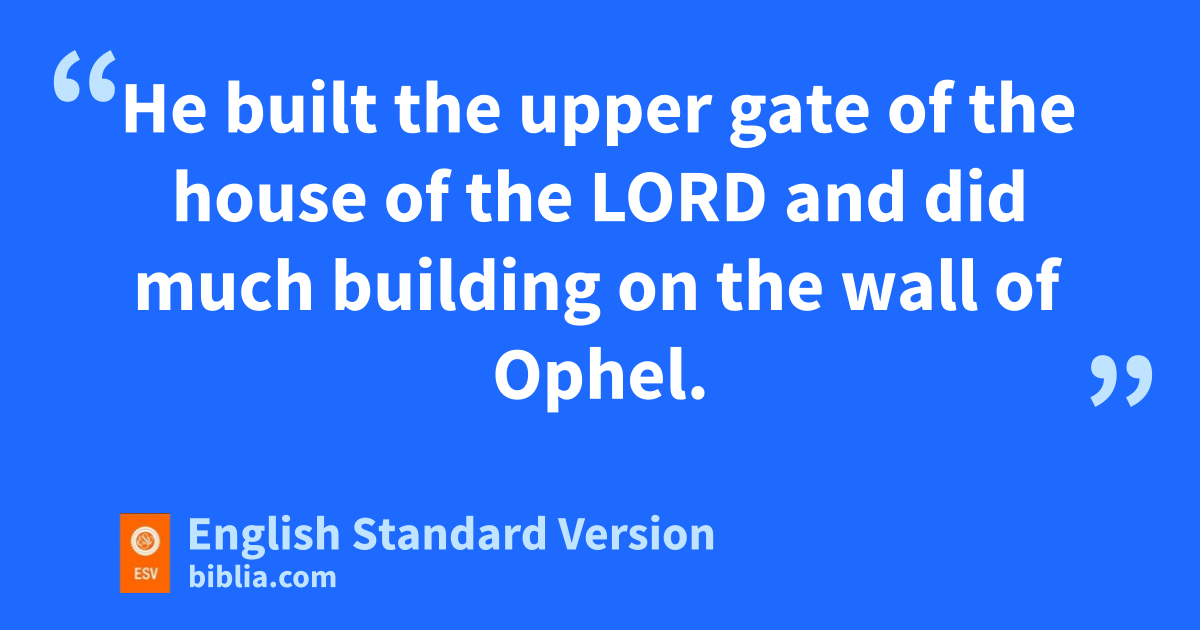 27 aJotham was twenty-five years old when he began to reign, and he reigned sixteen years in Jerusalem. His mother’s name was Jerushah the daughter of Zadok. 2 And he did what was right in the eyes of the Lord according to all that his father Uzziah had done, bexcept he did not enter the temple of the Lord. But the people still followed corrupt practices. 3 He built the upper gate of the house of the Lord and did much building on the wall of cOphel. 4 Moreover, he built cities in the hill country of Judah, and forts and towers on the wooded hills. 5 He fought with the king of the Ammonites and prevailed against them. And the Ammonites gave him that year 100 talents1 of silver, and 10,000 cors2 of wheat and 10,000 of barley. The Ammonites paid him the same amount in the second and the third years. 6 So Jotham became mighty, because he ordered his ways before the Lord his God. 7 dNow the rest of the acts of Jotham, and all his wars and his ways, behold, they are written in the Book of the Kings of Israel and Judah. 8 He was etwenty-five years old when he began to reign, and he reigned sixteen years in Jerusalem. 9 And Jotham slept with his fathers, and they buried him in the city of David, and Ahaz his son reigned in his place.
