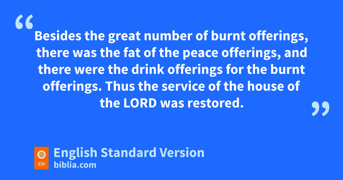 31 Then Hezekiah said, u“You have now consecrated yourselves to3 the Lord. Come near; bring sacrifices and thank offerings to the house of the Lord.” And the assembly brought sacrifices and thank offerings, and all who were vof a willing heart brought burnt offerings. 32 The number of the burnt offerings that the assembly brought was 70 bulls, 100 rams, and 200 lambs; all these were for a burnt offering to the Lord. 33 And the consecrated offerings were 600 bulls and 3,000 sheep. 34 But the priests were too few and could not flay all the burnt offerings, so until other priests had consecrated themselves, wtheir brothers the Levites helped them, until the work was finished—xfor the Levites were more upright in heart than the priests in consecrating themselves. 35 Besides the great number of burnt offerings, there was ythe fat of the peace offerings, and there were zthe drink offerings for the burnt offerings. Thus the service of the house of the Lord was restored. 36 And Hezekiah and all the people rejoiced because God had provided for the people, for the thing came about suddenly.