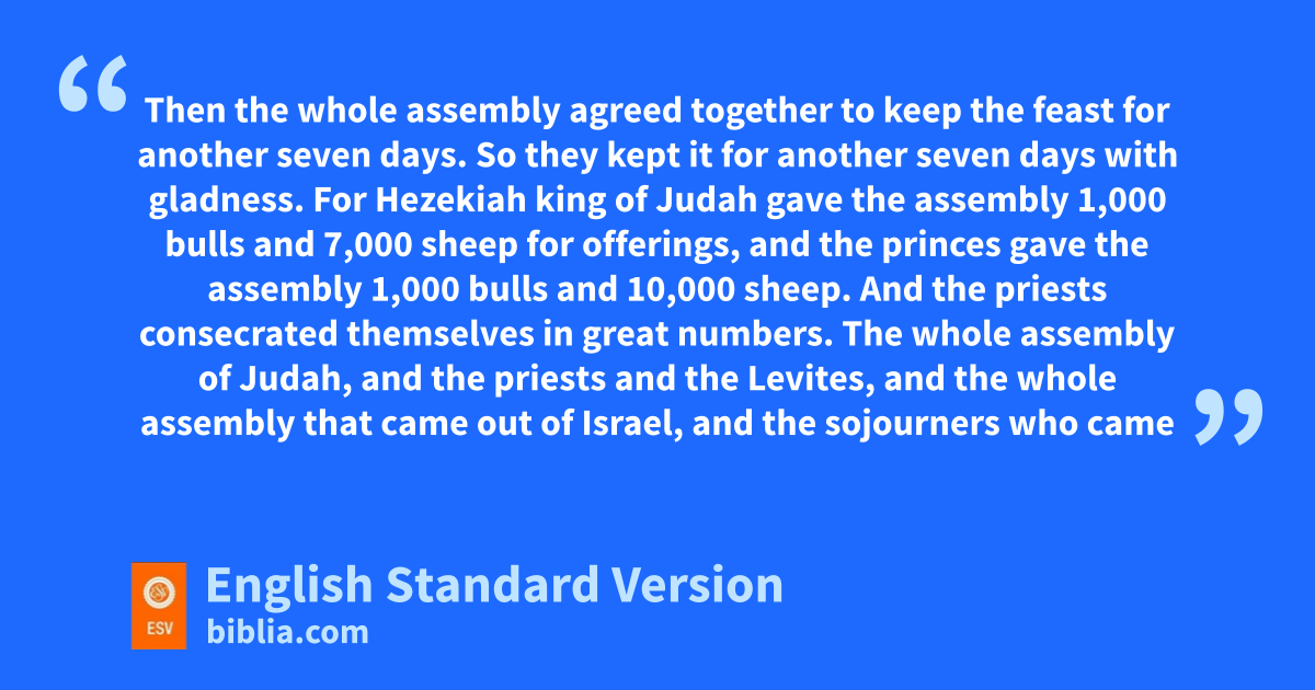 23 Then the whole assembly agreed together to keep the feast ffor another seven days. So they kept it for another seven days with gladness. 24 For Hezekiah king of Judah ggave the assembly 1,000 bulls and 7,000 sheep for offerings, and the princes gave the assembly 1,000 bulls and 10,000 sheep. And the priests hconsecrated themselves in great numbers. 25 The whole assembly of Judah, and the priests and the Levites, iand the whole assembly that came out of Israel, and the sojourners who came out of the land of Israel, and the sojourners who lived in Judah, rejoiced. 26 So there was great joy in Jerusalem, for jsince the time of Solomon the son of David king of Israel there had been nothing like this in Jerusalem. 27 Then kthe priests and the Levites arose and lblessed the people, and their voice was heard, and their prayer came to mhis holy habitation in heaven.