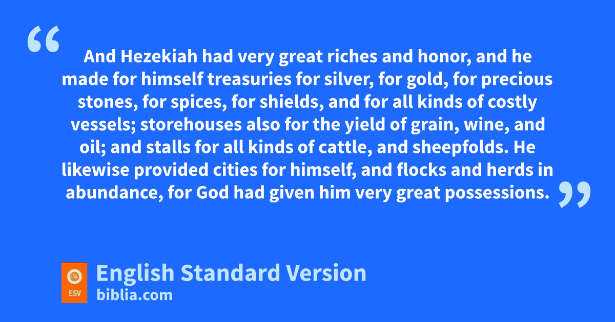 27 And Hezekiah had very great riches and honor, and he made for himself treasuries for silver, for gold, for precious stones, for spices, for shields, and for all kinds of acostly vessels; 28 storehouses also for the yield of grain, wine, and oil; and stalls for all kinds of cattle, and sheepfolds. 29 He likewise provided cities for himself, and flocks and herds in abundance, for God had given him very great possessions. 30 This same Hezekiah bclosed the upper outlet of the waters of cGihon and directed them down to the west side of the city of David. And Hezekiah prospered in all his works. 31 And so in the matter of the envoys of the princes of Babylon, dwho had been sent to him to inquire about ethe sign that had been done in the land, God left him to himself, fin order to test him and to know all that was in his heart.