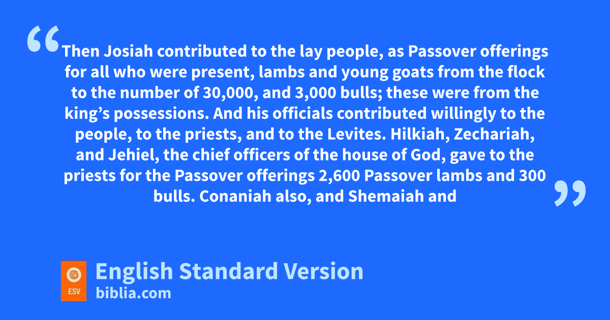 7 Then Josiah contributed to the lay people, as Passover offerings for all who were present, lambs and young goats from the flock to the number of 30,000, and 3,000 bulls; qthese were from the king’s possessions. 8 And his officials contributed willingly to the people, to the priests, and to the Levites. rHilkiah, Zechariah, and Jehiel, the chief officers of the house of God, gave to the priests for the Passover offerings 2,600 Passover lambs and 300 bulls. 9 Conaniah also, and Shemaiah and Nethanel his brothers, and Hashabiah and Jeiel and Jozabad, the chiefs of the Levites, gave to the Levites for the Passover offerings 5,000 lambs and young goats and 500 bulls.