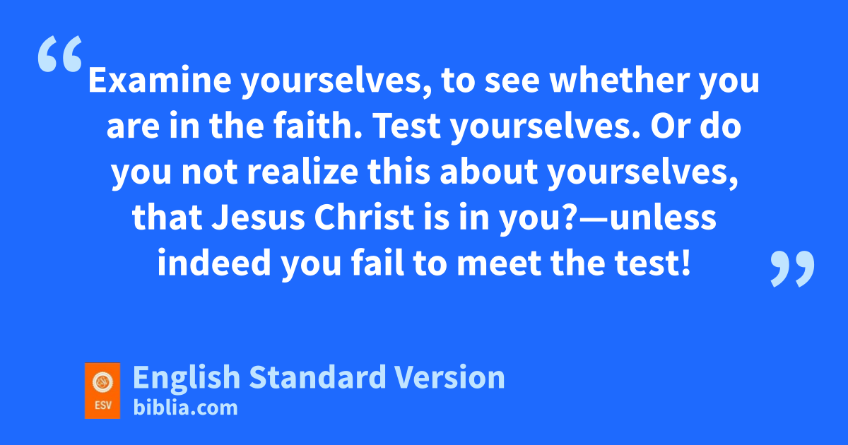 5 Examine yourselves, to see whether you are in the faith. vTest yourselves. Or do you not realize this about yourselves, that wJesus Christ is in you?—unless indeed you fail to meet the test! 6 I hope you will find out that we have not failed the test. 7 But we pray to God that you may not do wrong—not that we may appear to have met the test, but that you may do what is right, though we may seem to have failed. 8 For we cannot do anything against the truth, but only for the truth. 9 For we are glad when xwe are weak and you are strong. Your yrestoration is what we pray for. 10 For this reason I write these things while I am away from you, that when I come zI may not have to be asevere in my use of bthe authority that the Lord has given me for building up and not for tearing down.