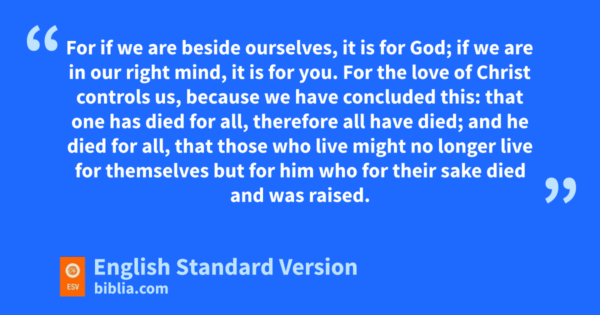 11 Therefore, knowing ythe fear of the Lord, we persuade others. But zwhat we are is known to God, and I hope it is known also to your conscience. 12 aWe are not commending ourselves to you again but bgiving you cause to boast about us, so that you may be able to answer those who boast about outward appearance and not about what is in the heart. 13 For if we care beside ourselves, it is for God; if we are in our right mind, it is for you. 14 For the love of Christ dcontrols us, because we have concluded this: that eone has died for all, therefore all have died; 15 and he died for all, fthat those who live might no longer live for themselves but gfor him who for their sake died and was raised.