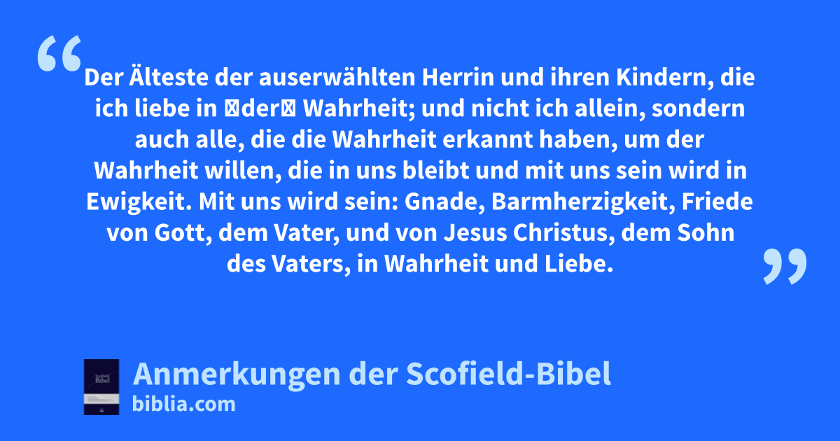 1 Der Älteste* der auserwählten Herrin* und ihren Kindern, die ich liebe in ⟨der⟩ Wahrheit; und nicht ich allein, sondern auch alle, die die Wahrheit erkannt haben, 2 um der Wahrheit willen, die in uns bleibtc und mit uns sein wird in Ewigkeitd. 3 Mit uns wird sein: Gnade* , Barmherzigkeit, Friede von Gott, dem Vater, und von Jesus Christus, dem Sohn des Vaters, in Wahrheit und Liebe.