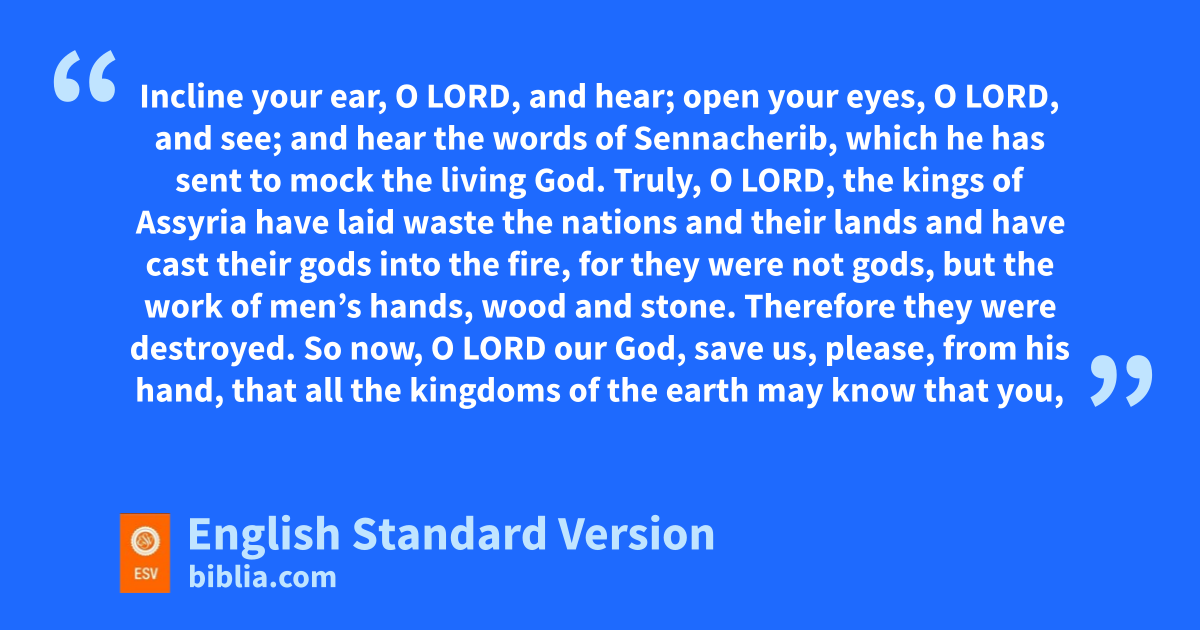 14 Hezekiah received nthe letter from the hand of the messengers and read it; and Hezekiah went up to the house of the Lord and spread it before the Lord. 15 And Hezekiah prayed before the Lord and said: “O Lord, the God of Israel, oenthroned above the cherubim, pyou are the God, you alone, of all the kingdoms of the earth; you have made the heavens and the earth. 16 qIncline your ear, O Lord, and hear; ropen your eyes, O Lord, and see; and hear the words of Sennacherib, which he has sent sto mock the living God. 17 Truly, O Lord, the kings of Assyria have laid waste the nations and their lands 18 and have cast their gods into the fire, for they were not gods, tbut the work of men’s hands, wood and stone. Therefore they were destroyed. 19 So now, O Lord our God, save us, please, from his hand, uthat all the kingdoms of the earth may know that pyou, O Lord, are God alone.”