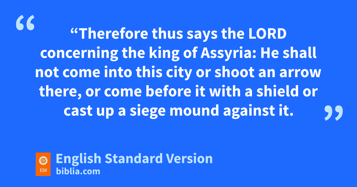 32 “Therefore thus says the Lord concerning the king of Assyria: He shall not come into this city or shoot an arrow there, or come before it with a shield or qcast up a siege mound against it. 33 rBy the way that he came, by the same he shall return, and he shall not come into this city, declares the Lord. 34 sFor I will defend this city to save it, for my own sake tand for the sake of my servant David.”