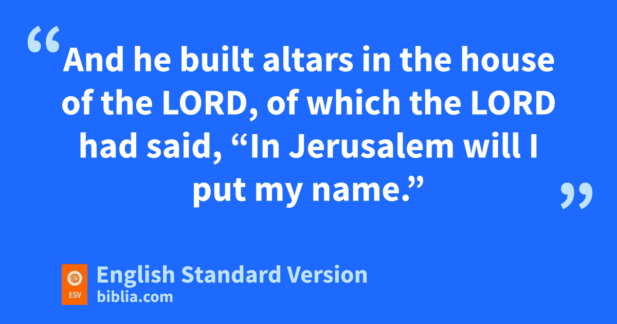 21 xManasseh was twelve years old when he began to reign, and he reigned fifty-five years in Jerusalem. His mother’s name was Hephzibah. 2 And he did what was evil in the sight of the Lord, yaccording to the despicable practices of the nations whom the Lord drove out before the people of Israel. 3 For he rebuilt the high places zthat Hezekiah his father had destroyed, and he erected altars for Baal and made aan Asherah, bas Ahab king of Israel had done, cand worshiped all the host of heaven and served them. 4 dAnd he built altars in the house of the Lord, of which the Lord had said, e“In Jerusalem will I put my name.” 5 And he built altars cfor all the host of heaven in fthe two courts of the house of the Lord. 6 gAnd he burned his son as an offering1 and hused fortune-telling and iomens and dealt jwith mediums and with necromancers. He did much evil in the sight of the Lord, provoking him to anger. 7 And the carved image of aAsherah that he had made he set in the house of which the Lord said to David and to Solomon his son, “In this house, eand in Jerusalem, which I have chosen out of all the tribes of Israel, I will put my name forever. 8 kAnd I will not cause the feet of Israel to wander anymore out of the land that I gave to their fathers, if only they will be careful to do according to all that I have commanded them, and according to all the Law that my servant Moses commanded them.” 9 But they did not listen, and Manasseh led them astray to do more evil than the nations had done whom the Lord destroyed before the people of Israel.