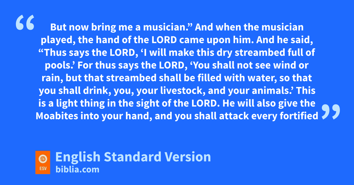 13 And Elisha said to the king of Israel, s“What have I to do with you? Go to tthe prophets of your father and to uthe prophets of your mother.” But the king of Israel said to him, “No; it is othe Lord who has called these three kings to give them into the hand of Moab.” 14 And Elisha said, v“As the Lord of hosts lives, before whom I stand, were it not that I have regard for Jehoshaphat the king of Judah, I would neither look at you nor see you. 15 But now wbring me a musician.” And when the musician played, xthe hand of the Lord came upon him. 16 And he said, “Thus says the Lord, ‘I will make this dry streambed full of pools.’ 17 For thus says the Lord, ‘You shall not see wind or rain, but that streambed shall be filled with water, so that you shall drink, you, your livestock, and your animals.’ 18 This is a light thing in the sight of the Lord. He will also give the Moabites into your hand, 19 and you shall attack every fortified city and every choice city, and shall fell every good tree and stop up all springs of water yand ruin every good piece of land with stones.” 20 The next morning, about the time of zoffering the sacrifice, behold, water came from the direction of Edom, till the country was filled with water.