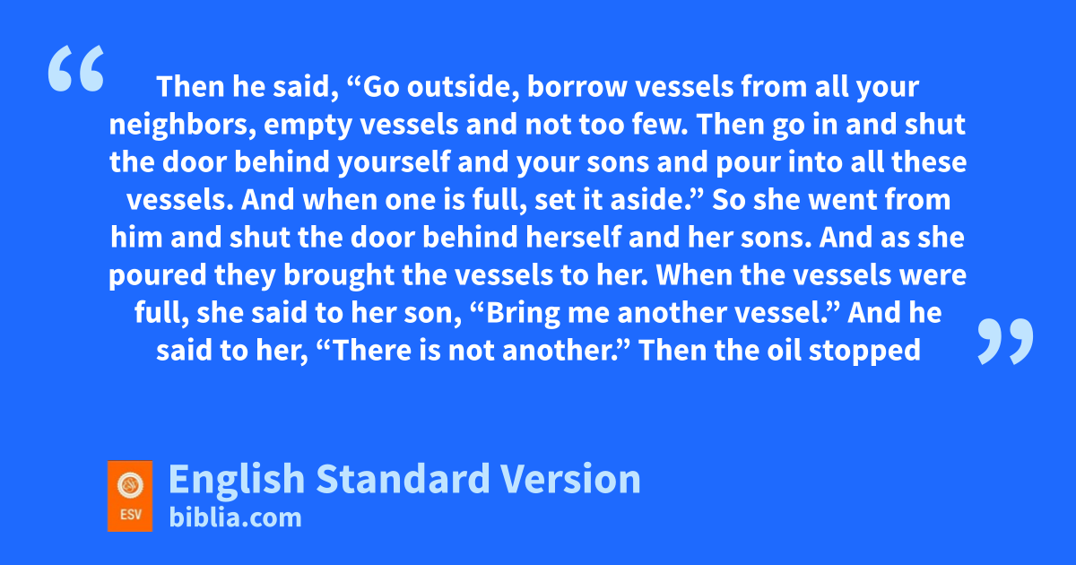 4 Now the wife of one of the esons of the prophets cried to Elisha, “Your servant my husband is dead, and you know that your servant feared the Lord, fbut the creditor has come to take my two children to be his slaves.” 2 And Elisha said to her, “What shall I do for you? Tell me; what have you in the house?” And she said, “Your servant has nothing in the house except a jar of oil.” 3 Then he said, “Go outside, borrow vessels from all your neighbors, empty vessels and not too few. 4 Then go in and shut the door behind yourself and your sons and pour into all these vessels. And when one is full, set it aside.” 5 So she went from him and shut the door behind herself and her sons. And as she poured they brought the vessels to her. 6 When the vessels were full, she said to her son, “Bring me another vessel.” And he said to her, “There is not another.” Then the oil stopped flowing. 7 She came and told the gman of God, and he said, “Go, sell the oil and pay your debts, and you and your sons can live on the rest.”